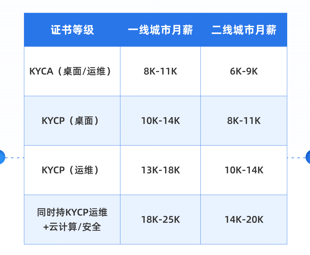 官方16课时,对应考纲:Shell基础、用户组批量管理、文件与软件包管理、进程监控、计划任务、母盘制作与网络同传。结课可带2-3人小组完成几十台电脑的批量rollout,薪资普遍比KYCA高。