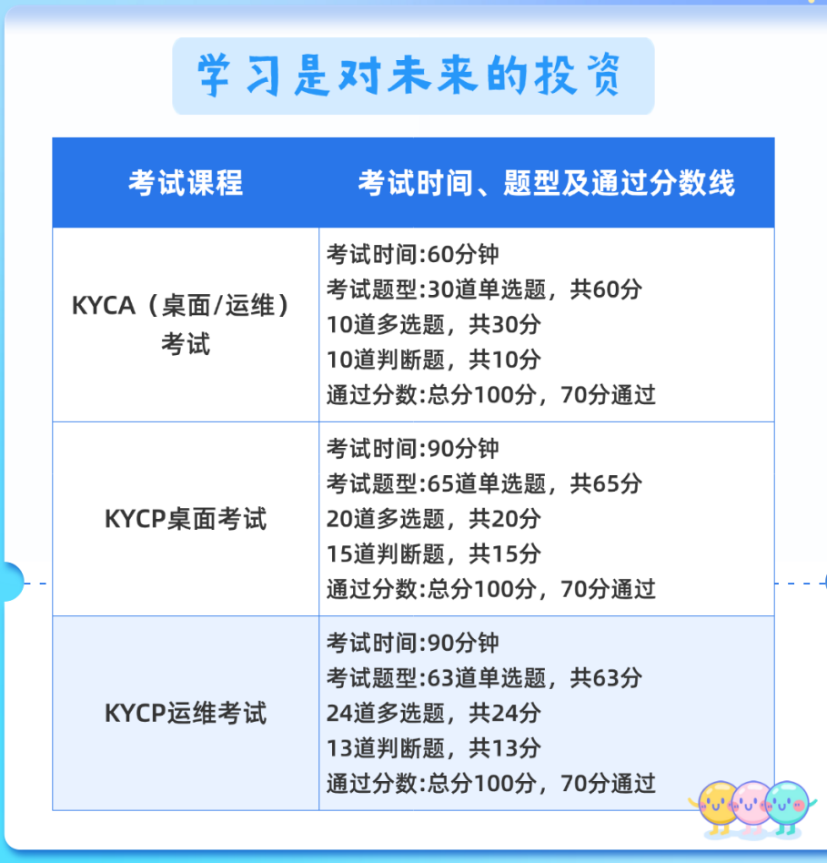 →KYCA课程随时学完随时考试,KYCP课程每月20号左右统一安排考试。当月未参考的考生可延期一次。